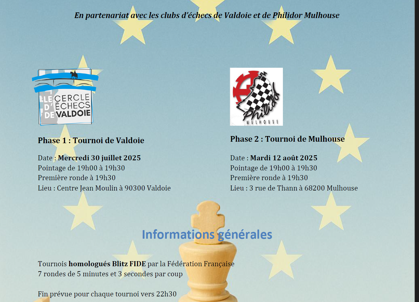 Je vous annonce notre prochain tournoi Blitz, organisé en partenariat avec le club d’échecs de Valdoie. Il se déroulera en deux phases distinctes, la première le mercredi 30 juillet 2025 à 19h30 à Valdoie, et la seconde le mardi 12 août 2025 à 19h30 à Mulhouse.